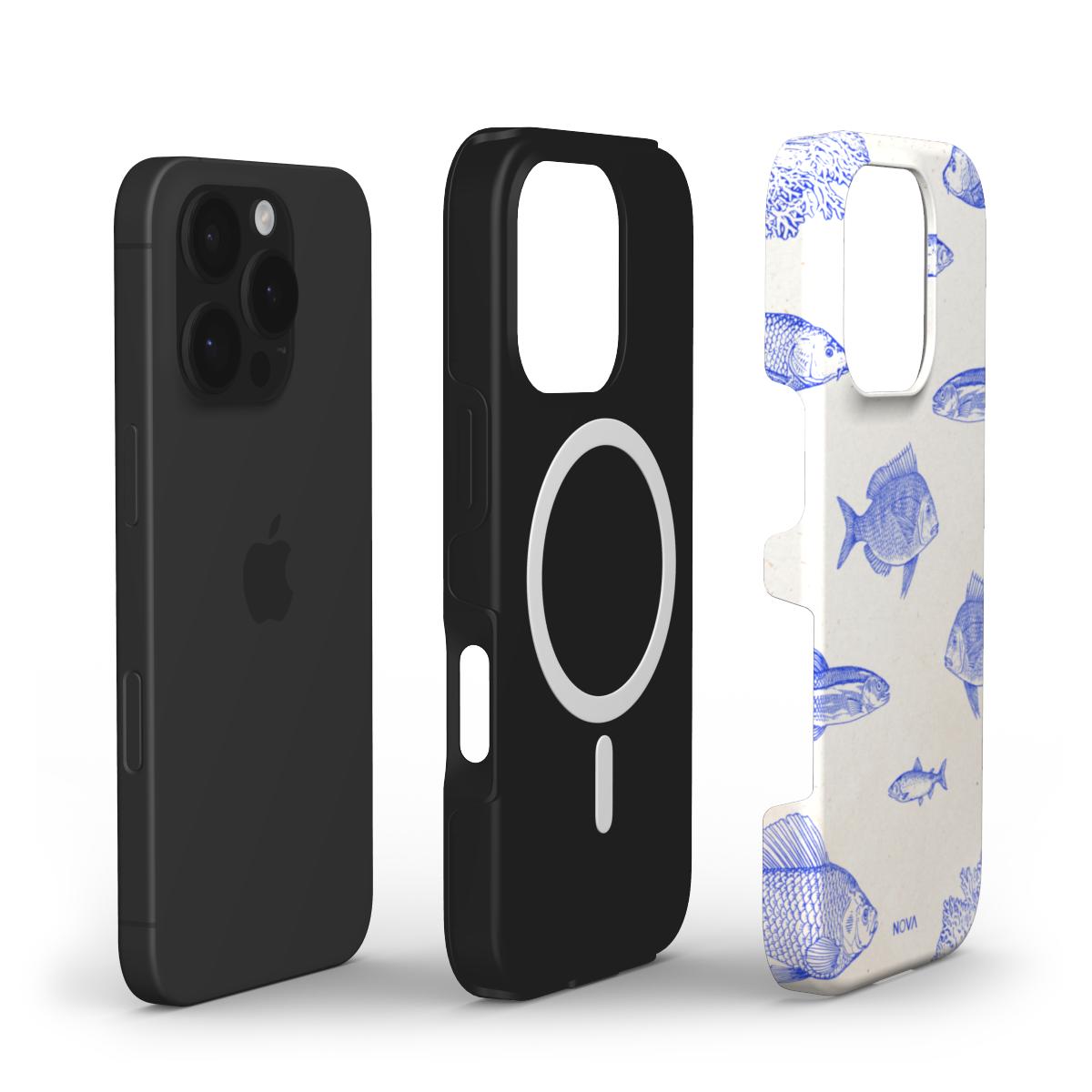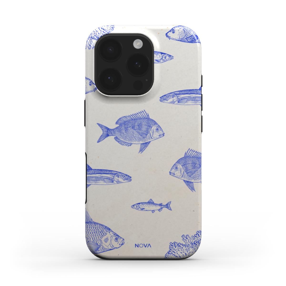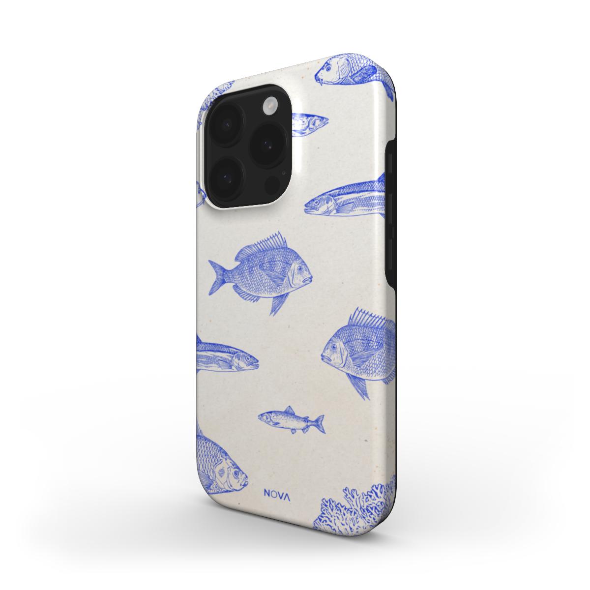 Designkenmerken: Een elegant maritiem ontwerp met een crèmekleurige achtergrond en fijne kobaltblauwe lijntekeningen van vissen en koraal. De subtiele details en vintage textuur geven het hoesje een kunstzinnige en rustgevende uitstraling – ideaal voor liefhebbers van de zee en minimalistische esthetiek.